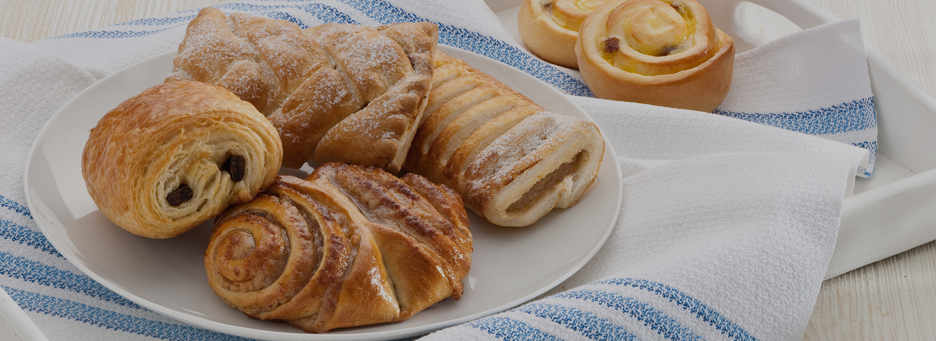Baker’s selection containing fresh croissants, variety of muffins and danishes